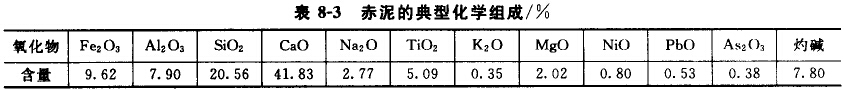 赤泥是制鋁工業從鋁上礦中提煉氧化鋁后殘留的一種紅色、粉泥狀、高含水量的強堿性固體廢料,密度0.7-1.0t/m3,比表面積0.5-0.8m2/g。赤泥的組成和性質復雜,并隨礦石成分、氧化鋁生產工藝,及赤泥的脫水、陳化程度有所變化,其典型化學成分如表8-3所示。