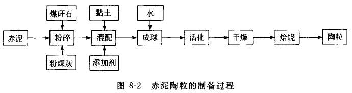 赤泥在建材工業中的其他用途還有:制備赤泥陶粒(工藝流程如圖8-2所示)、生產玻璃、流態自硬砂硬化劑,用作塑料填充劑、防滲材料、鋪路等,日前已有部分投人生產運營。但赤泥的使用量仍很低,這是由于赤泥中臺有大量堿液,有的赤泥中尚含有U、Th、Sc、La、Y、Ta、Nb等放射性元素和稀有金后,如長期身處這類建材中,將直接危害人體健康。