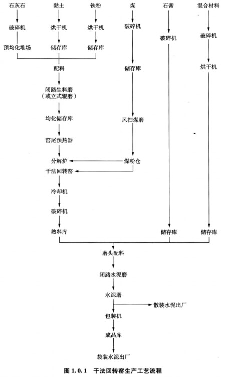 水泥生產工藝流程有干法回轉窯生產工藝流程、濕法回轉窯生產工藝流程和立窯生產工藝流程等。于法回轉窯生產工藝流程見圖1.0.1,立窯生產丁藝流程見圖1.0.2。