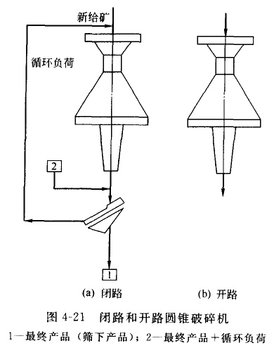 開(kāi)路圓錐破碎機(jī)圖4-21(b)的破碎比不超過(guò)4-6。這種破碎機(jī)的主要優(yōu)點(diǎn)是在處理硬的和磨蝕性強(qiáng)的物料時(shí)技術(shù)性能變化較小,在哈薩克斯坦的杰茲L茲干礦床處埋硫化銅礦石,在從開(kāi)路變?yōu)殚]路破碎時(shí),破腫機(jī)產(chǎn)量從250t/h減小到16t/h,產(chǎn)品粒度從35mm減小至16mm。盡管必須增加工作區(qū)表向積和安裝一些附加設(shè)備,促這種閉路流程是合理的,因此,球磨機(jī)的產(chǎn)量增加了22%。