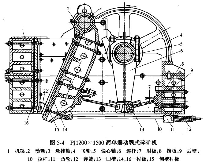 碎礦機的工作機構,是內固定額板和可動領板所構成的破碎腔。是破碎礦石的地方,故容易磨損,其上面裝有可拆卸的襯板,襯板14及16通常采用耐磨材料高錳鋼制造。在外國有采用耐磨性很高的高錳—鎳鋼和高錳—鑰鋼制造,但因其價格十分昂貴,所以我國采用得較少。在破碎軟礦石時.也可以采用冷硬鑄鐵。襯板各部分的磨損情況是不一樣的,通常下部磨損快,為了延長其使用期限,往往將襯板制成可以互換的若干塊或可以調頭的。對于小型破碎機,多采用調頭的辦法。可以將使用期限延長一倍或一倍以上。大型碎礦機,則多采用將磨損襯板單塊更換或上下部襯板互換的辦法,以延長其使用期限。