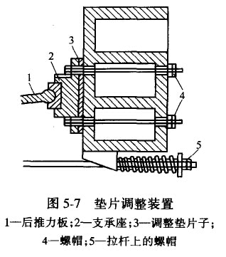 (2)墊片調整裝置。如圖5-7所示,在后推力板1的支承座2后面放入一組厚度相同的墊片3,改變墊片的數量,即可達到調整徘礦口大小的目的。在調整排礦口時,要先特螺帽4及拉桿彈簧螺帽5松開,然后增加或減少墊片的數目,待排礦口調整好后,再將螺帽4上緊,并調整彈簧上的螺帽5。用此法可以達到多級調整,調整時也比較方便,同時可以使機器結構緊湊和質量減小。但調整時必須停車。這種方法常用在大、中型碎礦機上。