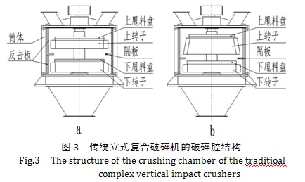 目前大多立式復合破碎機的破碎腔結構有兩種如圖3所示:a為上、下轉子圓柱形,b為上錐形、下圓柱形轉子,上、下轉子間的環形隔板或篦板將破碎腔分上、下兩部分,上下轉子圓周均布有錘頭,旋轉的轉子錘頭與反擊板之間形成環形間隙,且由上至下的間隙是由大到小,一般情況下,上部為中碎破碎腔,下部為細碎破碎腔。[2]、[3]