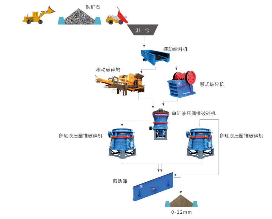 需要加工的銅礦石首先要經過破碎環節。經由料倉供給振動給料機,振動給料機均勻地送進顎式破碎機進行初級破碎,將大塊兒原礦石破碎成小塊兒礦石;粗碎后的銅礦石經過篩分后,由皮帶機送到圓錐破碎機進行中碎和細碎,將礦石破碎成更小尺寸的礦石顆粒。