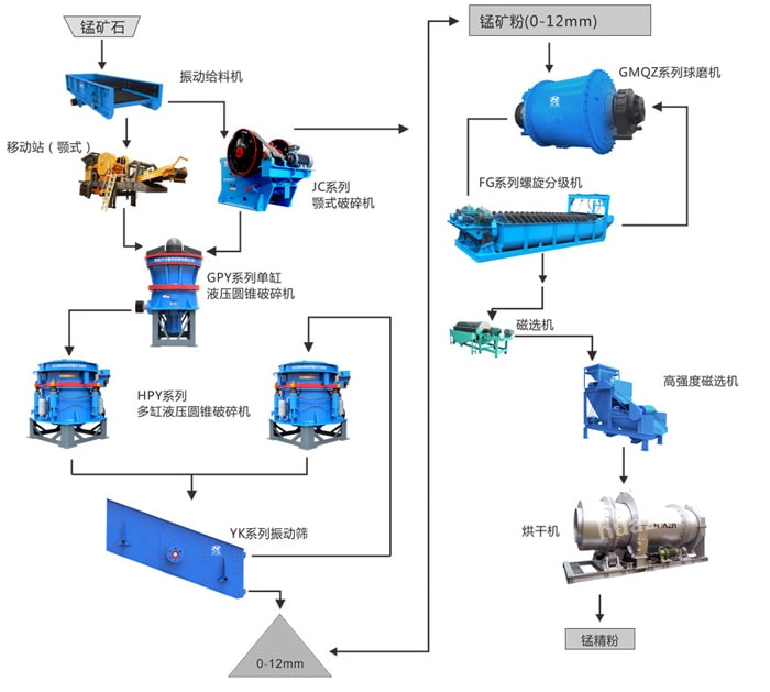 大塊的錳礦石經料倉由振動給料機均勻地送進顎式破碎機或移動顎式破碎站進行粗碎;粗碎后的錳礦石經過振動篩篩分后,由皮帶輸送機送到單缸液壓圓錐式破碎機進行中碎;中碎后的錳礦石物料送入多缸液壓圓錐式破碎機進行細碎;