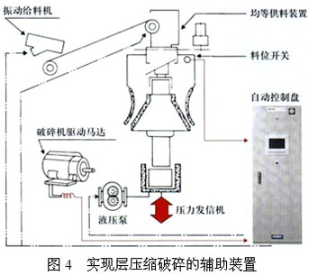 一般型號的設備為了得到較小的產品得把排料口調整得較小或利用特殊形狀的腔形,此種破碎是一個個的單粒直接壓縮的破碎方式,其結果是破碎機能力不能充分發揮,另外也因原料的負荷變動、水分等影響性能受明顯影響,造成通過量小,細粒的生產量也小,偏平偏長的產品多粒形不好(圖2),產品強度低,機械負荷大,機械的耐久性不好,有時不能平穩運轉。為了從根本上解決問題,破碎機改變了細碎的概念:加大排料口間隙,即使出口間隙大,只要滿足適當壓縮的做功條件,就有可能生產出更多的細粒產品。實現層壓縮破碎的設備出口間隙大并利用特殊的破碎腔形成復數的粒子層、提高破碎腔內的巖石密度、將破碎能量充分加給巖石,以達到破碎的目的(圖3)。為了實現層壓縮破碎,均勻布料裝置不可缺少,以防止原料粒度偏析、達到穩定運轉,破碎壁與軋臼壁磨損均一,零部件壽命長;為了實現層壓縮破碎,自動控制系統也不可缺少,該系統隨時監視液壓系統的壓力值、主電機的電流值及料位,根據負荷條件自動調整排料口間隙,以便能在最大負荷下運轉,獲得更大的產量及更好的粒形(圖4)。單粒破碎一般等于排料口尺寸的產品產量約占通過量的50%,層壓縮破碎一般等于排料口尺寸的產品約占通過量的70-80%(圖5)。