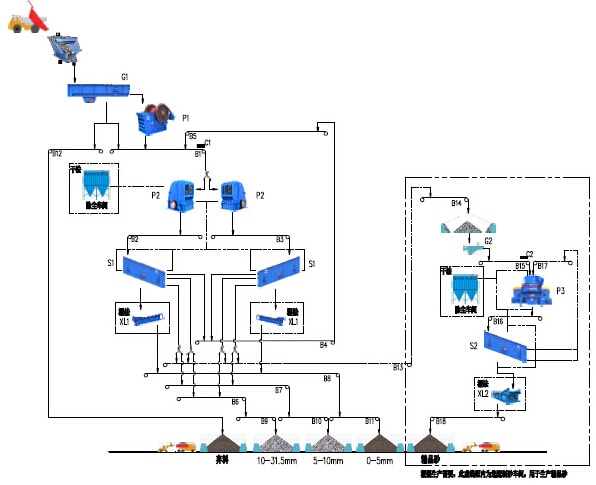 根據工程的需要,該系統也可以配置制砂系統,用于生產合理級配的精品砂(如虛線框內所示),當需要生產精品砂時,可以從一篩篩分車間篩分后分離出5-40mm的混合物料通過皮帶機輸送至制砂車間的半成品料倉,再通過振動給料機將物料均勻的給至制砂機,經過制砂機破碎后的成品混合料再通過皮帶輸送機輸送至二篩篩分車間進行篩分,從而分離出不同顆粒級別的成品。