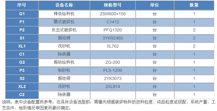 500t/h---石灰石(白云巖)類巖石的砂石骨料生產工藝設備配置表