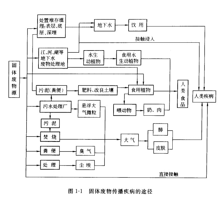 固體廢物特別是有害固體廢物,如處理、處置不當,具中的有毒有害物質如化學物質、病源微生物等可以通過外境介質一大氣、土壤、地慶或地下水體進人生態系統形成化學物質型污染和病原體型污染,對人體產牛危害,同時破壞個態環境,導致不可逆生態變化。其具體途徑取決于固體廢物本身的物理、化學和生物性質,而凰與固體廢物處置所在場地的水質、水文條件有關,如:有些可通過燕發直接進入大氣;但更多通過接觸浸入、食用或咽入受污染的飲用水或食物進入人體。固體廢物傳播疾病的途徑見圖1—1。