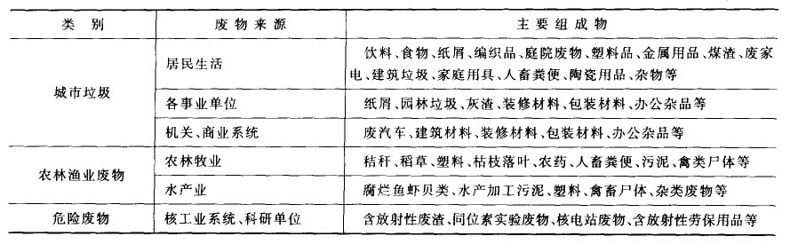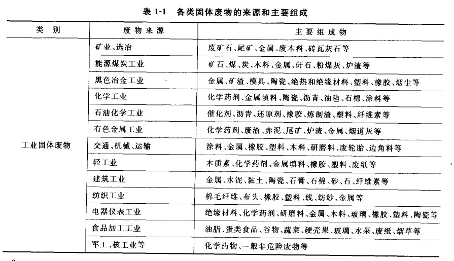 我國的工業固體廢棄物主要來自各個工業部門的個產環行和生產廢棄物,由于工業同體廢棄物常常具有毒性,破壞整個生態系統并對人體健康產生危害,因而越來越引起人們的重視,其中很多廢物劃人危險廢棄物一類進行涅慎處理。按行業可分為以下幾類:礦業、選冶,能源煤炭工業,黑色冶金工業,化學工業,石油化學丁業,有色金屬工業,交通、機械、運輸,輕工業,建筑業,紡糾工業,電器儀表業,食品加工業,軍工、核工業等。表1—1中列舉了各類固體廢物的來源利主要組成。