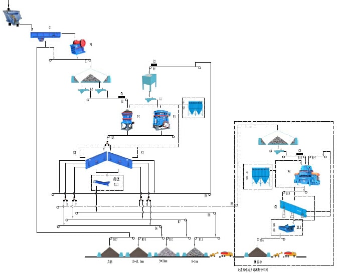 該系統(tǒng)示意工藝適用于時(shí)產(chǎn)400噸花崗巖、玄武巖類硬性物料的加工破碎,將經(jīng)過(guò)爆破處理或開挖、洞采的大塊毛料通過(guò)自卸車上料至原料倉(cāng),經(jīng)過(guò)具有預(yù)篩分功能的棒條給料機(jī)均勻的供給顎式破碎機(jī)破碎,經(jīng)顎式破碎機(jī)破碎后的半成品物料通過(guò)皮帶機(jī)輸送給具有中細(xì)碎功能的圓錐破碎機(jī)進(jìn)行二次破碎,經(jīng)圓錐破碎機(jī)二次破碎后的混合成品骨料經(jīng)過(guò)皮帶機(jī)輸送至后續(xù)一篩車間進(jìn)行分級(jí)篩分,篩分將大于用戶需要的大顆粒物料再通過(guò)皮帶機(jī)輸送至細(xì)碎圓錐破碎機(jī)進(jìn)行破碎,破碎后的物料也進(jìn)入一篩車間進(jìn)行篩分,滿足客戶需要的合格成品通過(guò)皮帶機(jī)輸送至成品料倉(cāng),不符合要求的大顆粒再次返回細(xì)碎圓錐破碎機(jī)進(jìn)行循環(huán)破碎。如果成品砂需要水洗也可在一篩下面配置洗砂機(jī)用于成品砂的水洗。該系統(tǒng)的棒條給料機(jī)還具有預(yù)篩分功能,可以將原料中的細(xì)顆粒物料提前分離直接進(jìn)入后續(xù)的破碎設(shè)備,也可將原料中的泥土雜物作為棄料預(yù)先分離。