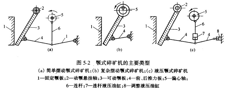 顎式碎礦機的類型很多,目前在我國選礦廠中使用最廣的主要有簡單擺動顎式碎礦機(如圖5-2a)和復(fù)雜擺動顆式碎礦機(如圖5-2b)兩種類型。近年來,由于液壓技術(shù)的應(yīng)用,在簡單擺動顎式碎礦機的基礎(chǔ)上制成了液壓顎式破碎機,如圖5-2c所示,在選礦廠也開始應(yīng)用。