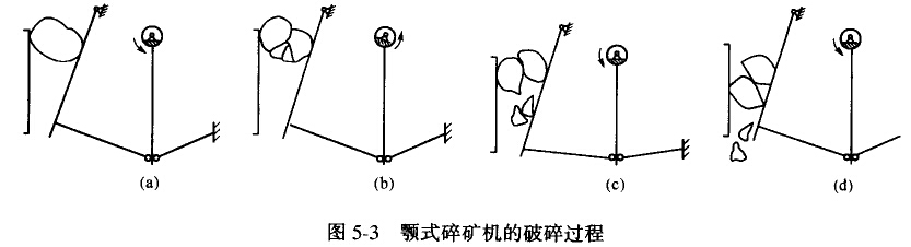 圖5-3為一大塊物料在顎式碎礦機中被破碎的過程。因5-3a是動顎板張到最大的位置,即動顎離固定顎最遠,此時鉤料進入破碎腔。圖5-3b是動顎逐漸向固定顎靠近,物料受擠壓,劈裂和折斷的作用產(chǎn)生裂縫而被破碎。圖5-3c是動顎靠近固定顎最近的位置,被破碎的物料分為幾個小塊。圖5-3d是動顎又張到最大位置,被破碎了的物料由于自重下落而從排礦口排出,大于排礦口的則落至下部與新給入的物料再次受到破碎。