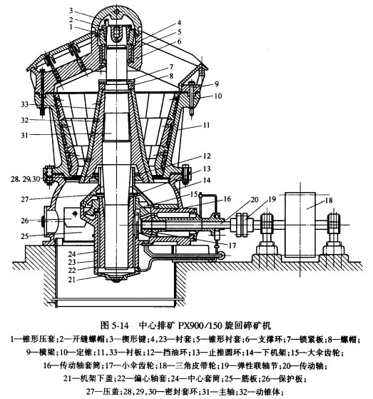 圖5-14是我國自制的PX900/150型中心排礦的旋回碎礦機。