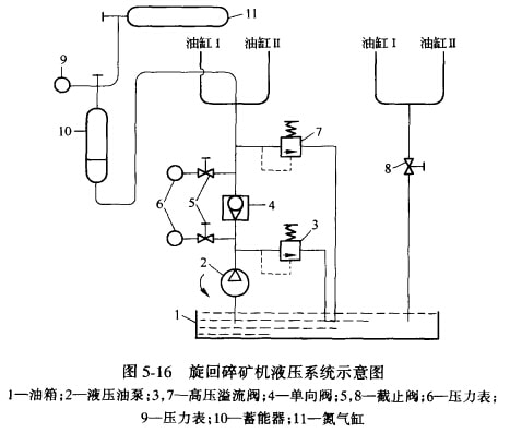 旋回碎礦機的液壓系統,如圖5-16所示。如果非破碎物尺寸太大,不能自動排出,當主軸和動錐下降到一定位置時,通過安裝在主軸上部的自整角發動機及電器控制系統自動切斷主電機電流,停車后,打開截止閥8將油卸出,取出非破碎物,再重新開車。當排礦口磨損后,需要調整時,可開動油泵向油缸補油,直到排礦口尺寸達到要求為止,隨后關閉油泵。調整排礦口尺寸時,可通過調整自整角接收儀表上的指針反映出排礦口大小,故調整極為方便。
