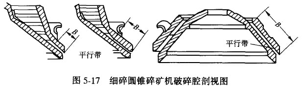中、細碎圓錐碎礦機按其破碎腔形狀不同可分為標準型、中間型及短頭型三種。它們的構造和工作原理完全相同,只是破碎膠的形狀不同,即平行帶的長度不同。如圖5-17所示。以標準型的平行帶最短,短頭型的平行帶最長,而中間型的平行帶長度介于二者之間。