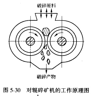 對輥破碎機的工作原理如圖5-30所示。物料從上面加入破碎機,兩個圓輥相向旋轉,由于物料與輥面的摩擦力將物料卷入破碎腔小,被輥子所壓碎。已破碎的礦石,在重力作用下,從兩個輥子間的間隙處排出。