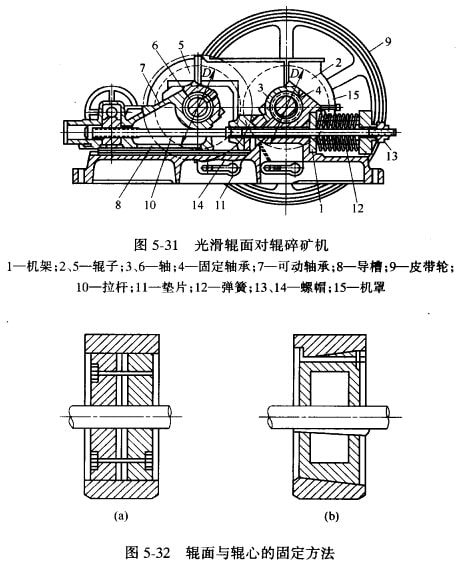 輥式破碎機的構造如圖5-3l所示。輥式破碎機的一個輥子2安裝在軸3上,軸3在固定于機架1廣的軸承4中旋轉,另一個破碎輥5(稱可動輥)則安裝在袖6上,軸6在可以滑動的軸承7中旋轉。軸承7是由拉桿10,墊片H、彈簧1Z、螺帽14和夾緊螺帽13固定在導槽8上。軸3和6的旋轉,可以分別用兩個電機帶動,也可用一個電機通過天軸傳動使兩個軸旋轉,或采用專門的長齒齒輪帶動兩個袖旋轉。皮帶輪9又起飛輪的作用。