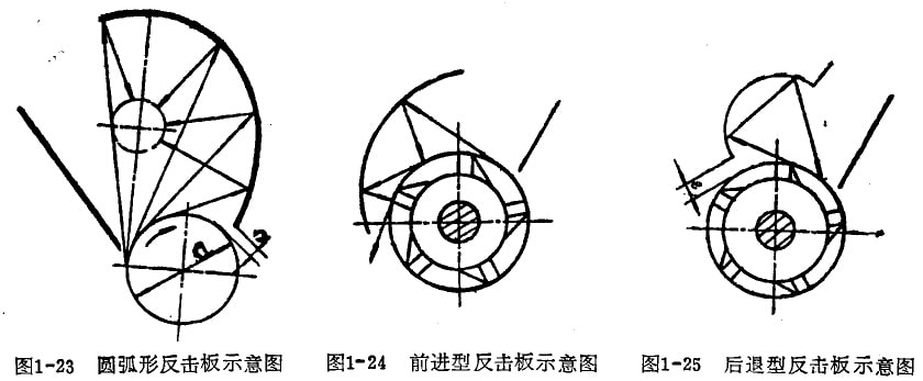 圖1-25所示為后退型的反擊板。物料的反彈軌跡朝加料端后退回到沖擊點,這樣可增加物料承受沖擊的次辦獲得較細粒級的產品。