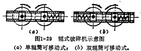 雙輥筒的輥式破碎機又可分為單輥可移動式和雙輥可移動式兩種(圖1-29)。輥筒的驅(qū)動分單輥驅(qū)動(由一個電動機和一套傳動系統(tǒng)組成)和雙輥驅(qū)動(兩個輥簡分別由兩個電動機和兩旁傳動系統(tǒng)組成)。