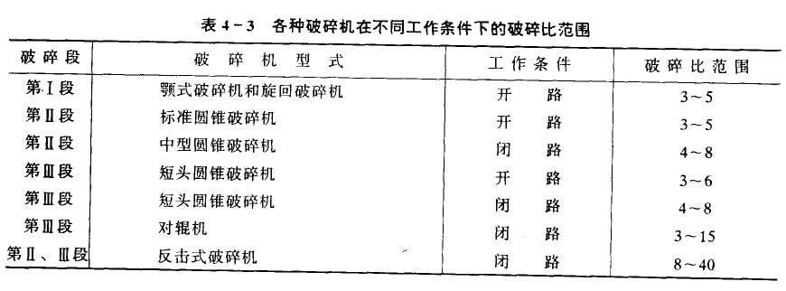 總破碎比等于各段破碎比之乘積。各段破碎比與各段破碎機的型式、流程類型和礦石性質有關:各種破辭扒在不同條件廠,其破碎比范圍,如表4—3所示(難碎性礦石取小值、易碎性礦石取大值)。