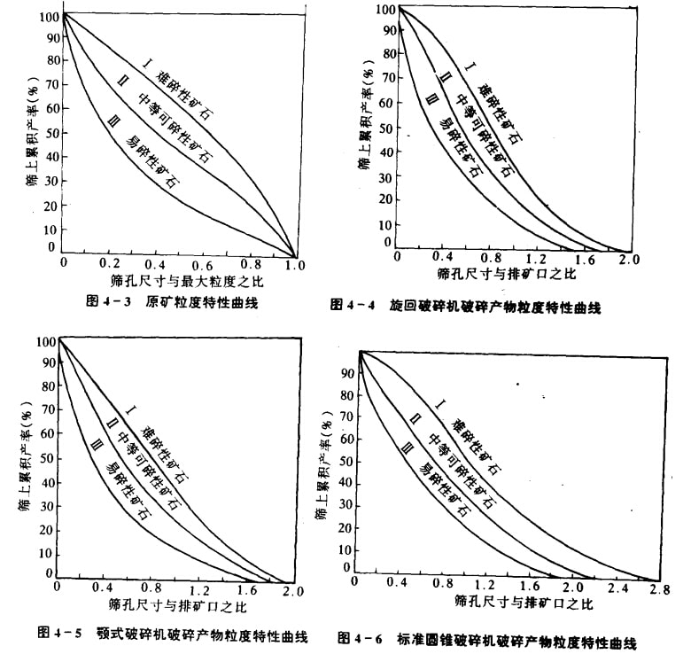 水分在破碎時的有害程度,視礦·石中礦泥含量而定。當礦石含泥多,水分高時,采用預先篩分可以減少破碎機的堵塞現象。生產實踐證明,大多數情況下,原礦中均含有一定數量的細粒物料,特別是易碎性礦石,其紉粒含量較多,如圖4—3所示。所以,粗碎前的預先篩分總是有利的。