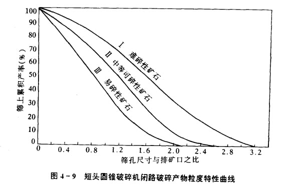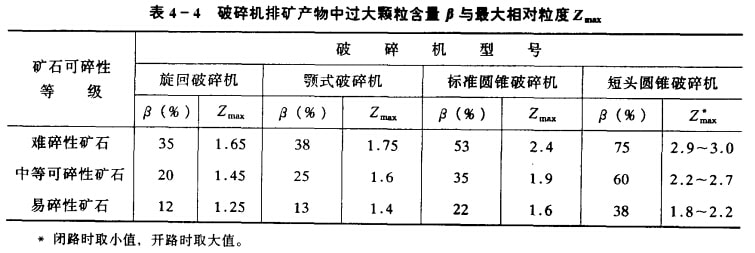 從表4—4可以看出,各種類型的破碎機的排礦產物中都有過大顆粒,而且過大顆粒的含量很高.如短頭圓錐破碎機破碎中等可碎性礦石時,排礦產物中過大顆粒含量高達60%,最大粒度為排礦口寬度的2.2—2.7倍;破碎難碎礦石時更為嚴重,B=75%,Zmm=2.9—3.0。