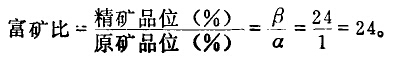 精礦品位(β)和原礦品位(α)之比叫富礦比。這個比值表示精礦中和用成分的含量比在原礦中有用成分的含量提高的倍數。如硫化銅礦,原礦中銅品位為1%,精礦中銅品位為24%,其富礦比為: