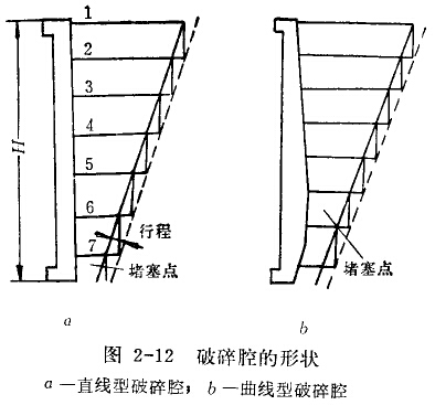 圖2-12b表示曲線型破碎腔,它是將固定顎襯板改成曲線形,曲線是按破碎腔的嚙角從上向下逐漸減小的原則而設計的。在曲線型破碎腔中,各連續的水平面間形成的梯形斷面的體積,從破碎腔的中部往下是逐漸增加的,因而礦石間的空隙增大,有利于排礦。由于堵塞點上移,故在排礦口附近不易發生堵塞現象。