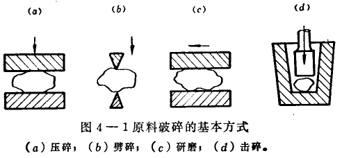 為了衡量原料在破碎前后粒度變化的程度和均衡分配備個破碎階段的工作量,常引用破碎比這一概念來表示原料的破碎過程。破碎比是原料在破碎前的最大粒度與破碎后的最大粒度之比值。破碎比取決于破碎機械的類型和構(gòu)造,也與送入破碎機的料塊大小有關(guān)。一般預(yù)碎階段的破碎比為2-10,中碎階段為2-8,細碎階段為10-20。不同破碎機械的破碎比不同,其破碎方式也不同,根據(jù)破碎機給予料塊的破碎力,原料的破碎方式大體可分為四種:壓碎、劈碎、研磨和擊碎,如圖4-1所示。