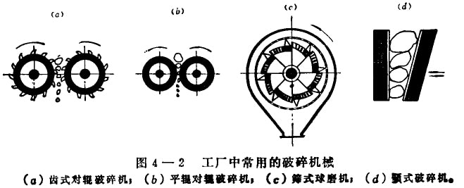 在工廠中常用的破碎機有;齒式對輥破碎機,如圖4-2(a),兩個表面帶齒的輥子相對轉(zhuǎn)動,牙齒不斷作用于料塊上,使料塊破碎;平輥對輥破碎機,如圖4-2(b),兩個相對旋轉(zhuǎn)的平滑圓輥不斷地壓在科塊上,將科塊壓碎;帶篩網(wǎng)式球磨機(篩式球磨機),如圖4-2(c),在回轉(zhuǎn)的筒體內(nèi)借鋼球的撞擊力和研磨作用,使料塊破碎;顎式破碎機,如圖4-2(d),通過擺動的顎板對料塊施加周期性的壓力,將料塊破碎。