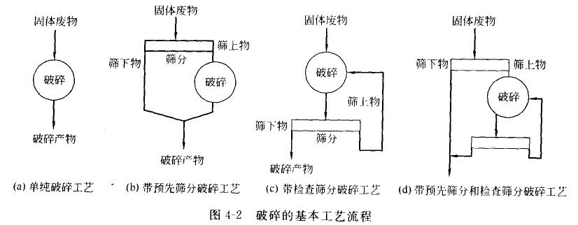 根據固體廢物的性質、顆粒的大小、要求達到的破碎比和選用的破碎機類型,每段破碎流程可以有不同的組合方式,其基本的工藝流程如圖4-2所示。