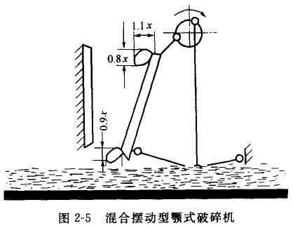 為了改善動(dòng)顎運(yùn)動(dòng)的軌跡,曾試制混合擺動(dòng)型顎式破碎機(jī),見(jiàn)圖2-5。動(dòng)顎與連桿共同安在偏心軸上,連桿頭裝在偏心軸的中部,而動(dòng)顎頭在連桿頭的兩側(cè)(動(dòng)顎頭呈叉子形)。動(dòng)顎運(yùn)動(dòng)軌跡是簡(jiǎn)擺型與復(fù)擺型的運(yùn)動(dòng)軌跡的綜合,其具體形狀由機(jī)構(gòu)的幾何關(guān)系而定。