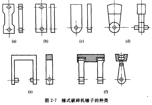 圖2-7(a)、(b)、(c)適用于破碎100-200mm的軟質(zhì)和中等硬度的物料,每個錘重從3.5-15kg不等。圖2-7(a)、(b)是兩端帶孔的,即當磨損后可以調(diào)換4次使用。圖2-7(d)是比較重型的,它的重心離中心較遠,故可用于破碎大塊(300mm以上)的中等硬度物料,錘重30-60kg。因2-7(e)、(f)主要用于較堅硬的物料,重達50-120kg。由于錘頭受物料的磨損作用,其端部打擊面很快磨損,因此多用錳鋼。