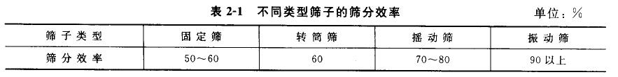 篩子運(yùn)動(dòng)方式對(duì)篩分效率有較大的影響,不同類(lèi)型的篩分設(shè)備,其篩子運(yùn)動(dòng)方式不同,其篩分效率亦不同。同一種固體廢物采用不同類(lèi)型的篩子進(jìn)行篩分時(shí),其篩分效率大致如表2-1所示。
