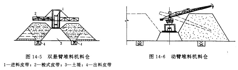 (3)堆料式料倉。堆料機是可以沿軌道移動,有懸臂擴大堆料范圍的專用機械。雙懇臂堆料機如圖14—5所示。動臂堆料機如圖14—6所示,動臂可以旋轉和仰俯(變幅范圍在土16°之間),能適應準料位置和堆料高度的變化,避免骨料躍落過高,產生遜徑。