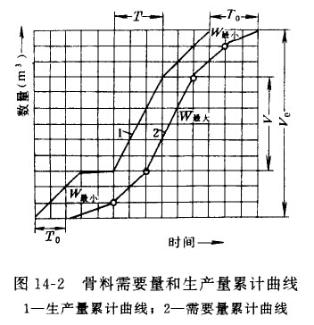 先根據混凝土澆筑計劃,繪出骨料需要量累計曲線,然后繪出骨料生產量累計曲線,圖14—2所示。
