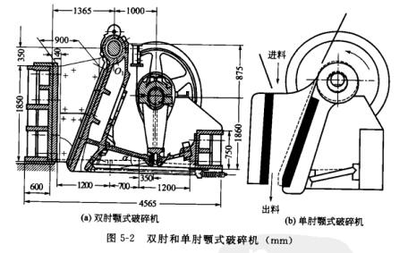 (3) 顎式破碎機。顎式破碎機是最為常見的粗碎機,靠擠壓法破碎礦石。具有兩個基本類型:雙肘和單肘(如圖5-2所示)。它們的工作腔由定顎和動顎組成,上寬下窄。在動顎擺動下擠壓礦石,使其尺寸逐步減縮并由下部排出。