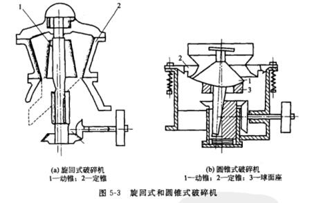 (4) 旋回式破碎機和圓錐式破碎機。旋回式和圓錐式破碎機的工作部分是固定的外錐和活動的內(nèi)錐,內(nèi)錐套裝在具有偏心的豎軸上,豎軸旋轉時內(nèi)錐在外錐內(nèi)做偏旋運動,物料在兩錐形成的環(huán)狀空間內(nèi)被擠壓和折斷。旋式破碎機是粗碎機,因為破碎腔是環(huán)形的,生產(chǎn)能力大致是顎式破碎機的2. 5倍,是大型礦山常用的粗碎機。圓錐式破碎機是中碎和細碎用的破碎機.如圖5- 3所示。