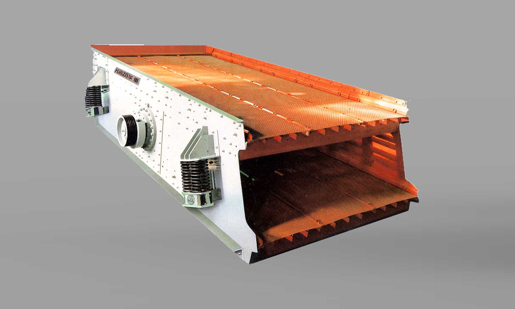 采用篩子橫梁與篩箱采用高強度螺栓,結(jié)構(gòu)簡單,維修方便快捷;振動篩采用塊偏心作為激振力,激振力強、電耗低、噪音小。